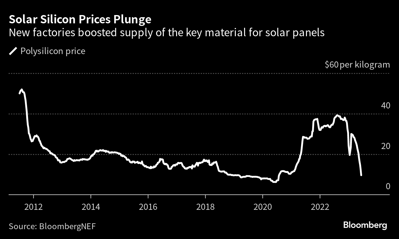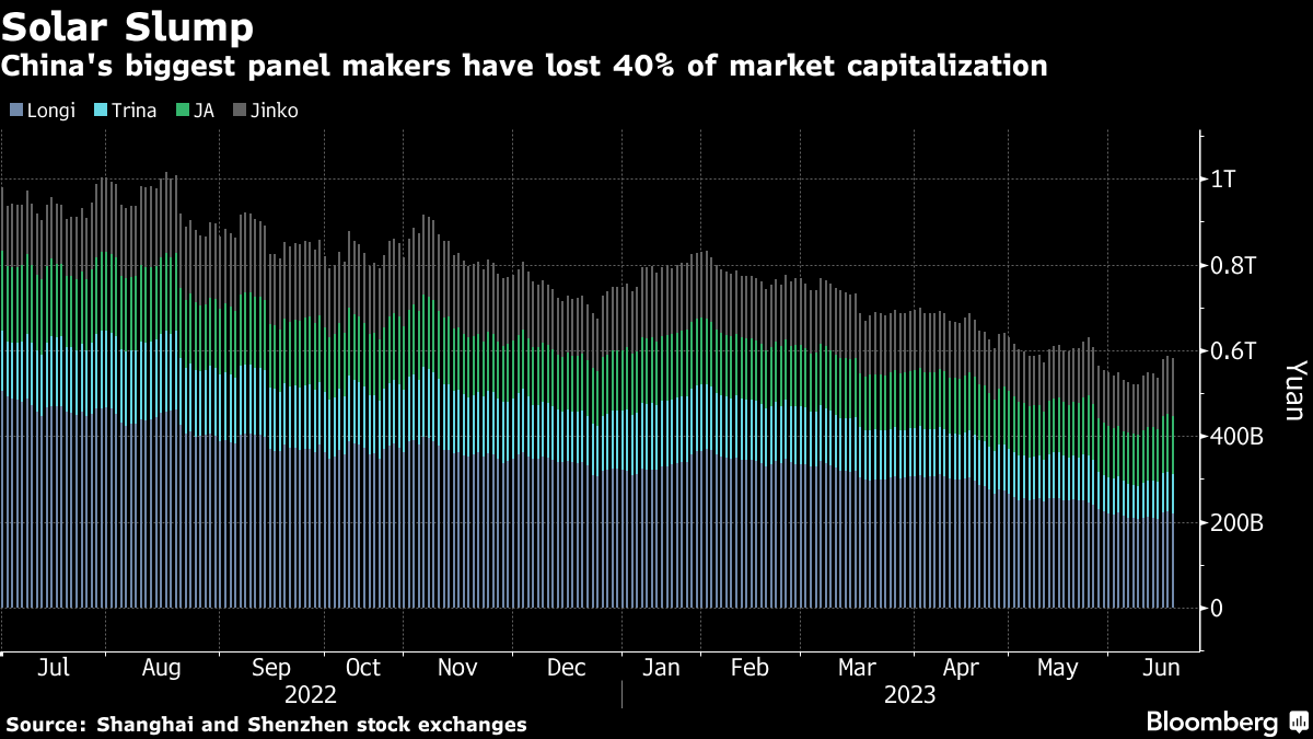 But that hasn’t been enough to keep momentum going for solar companies. Longi Green is down 54% from the end of July 2022, and fell as much as 2% on Wednesday in Shanghai. Trina Solar Co. has lost 49% over that same period, while JA Solar Technology Co. and Jinko Solar Co. are at least 22% lower.