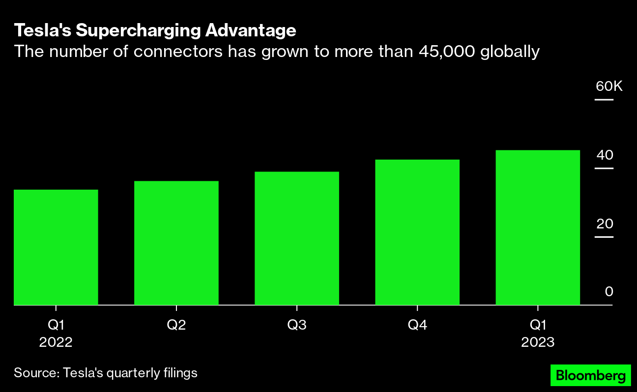 But it’s not just the Magic Dock. In recent weeks, two of Tesla’s biggest rivals—Ford Motor Co. and General Motors Co.— announced that they are partnering with Tesla on charging. In both cases, Ford and GM customers can buy a Tesla-made adapter that will allow them to access more than 12,000 Superchargers starting in early 2024. And in 2025, Tesla’s unique charging port will be built into Ford’s and GM’s electric vehicles. Selling a car is one thing; selling consumers an EV fueling experience is another, and one that provides an ongoing revenue stream. Tesla could potentially earn as much as $3 billion by 2030 from the Ford and GM charging deals, according to Piper Sandler & Co.
