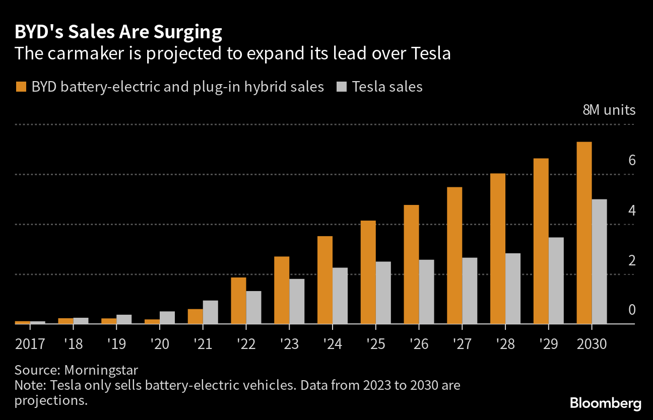 BYD’s sales, including EVs and plug-ins, are expected to reach about 2.7 million units this year — representing growth of more than 10-fold from where it was at the start of the pandemic, according to an estimate from Morningstar. Elon Musk’s Tesla will likely sell 1.8 million EVs, the firm predicts.