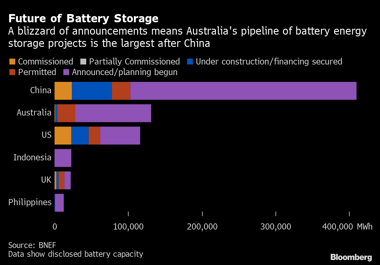 The country has at least 250 planned battery developments with a potential capacity of almost 130,000 megawatt-hours, a pipeline that’s second only to China, data compiled by BloombergNEF show. While Australia still relies on coal for more than half of its electricity generation, many major plants are set to close in the next decade.