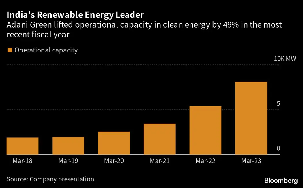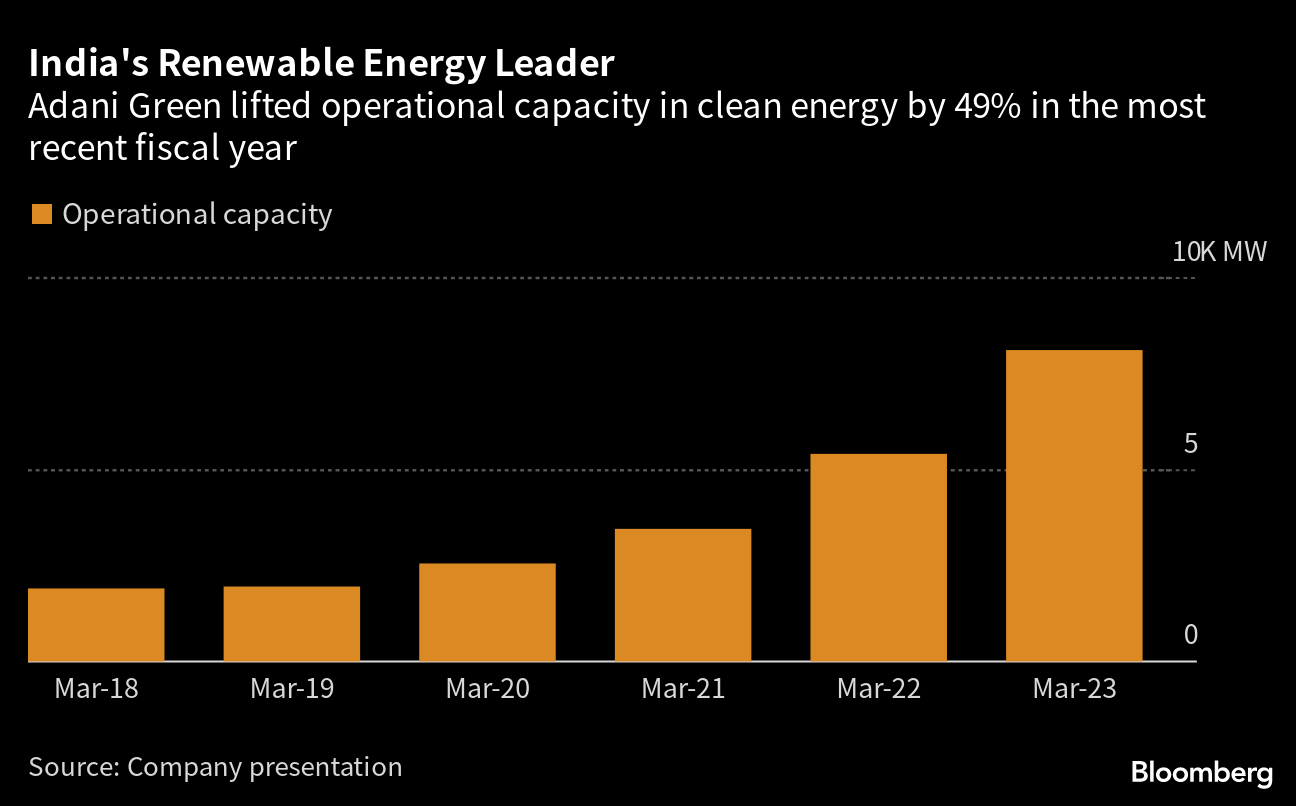 Adani Green’s operational capacity increased by almost half to more than 8 gigawatts in the financial year ended in March. The firm is targeting renewable energy capacity of 45 gigawatts by 2030, a goal that’s aligned with India’s aim to almost triple clean power generation capacity by that date.
