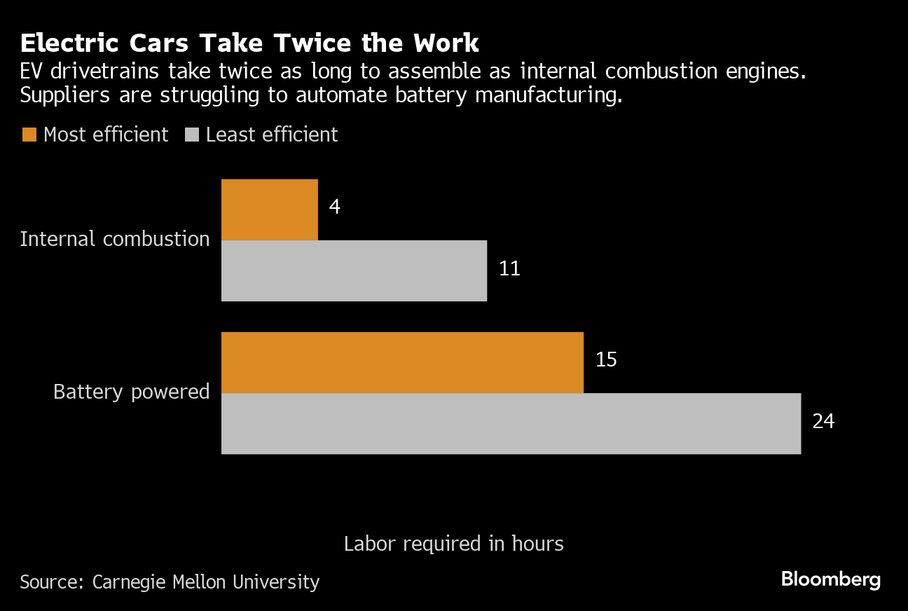 A recent study by researchers at Carnegie Mellon University found that manufacturing EV motors and batteries required roughly double as many man-hours as an internal combustion engine — up to 24 hours per machine.
