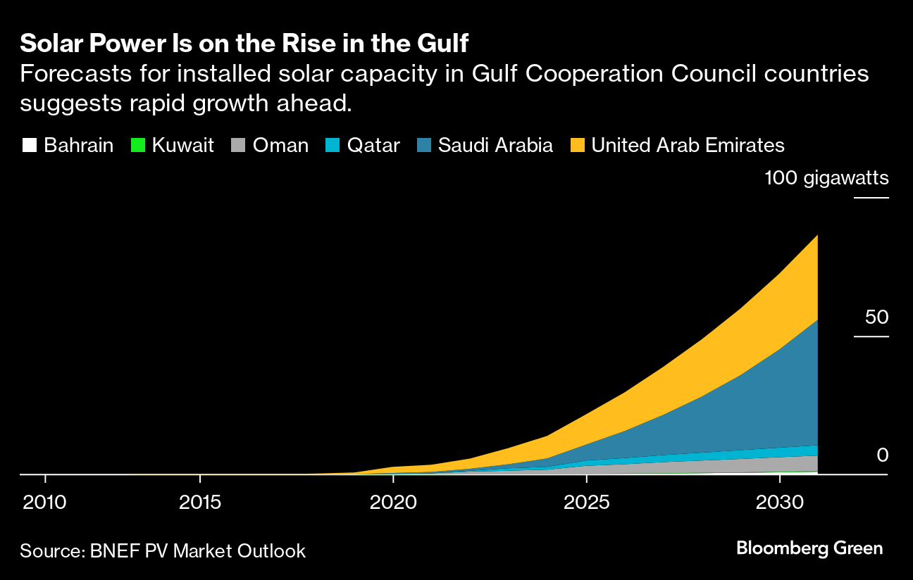 Gulf nations also need renewables to help bring down the cost of desalination, an energy- and carbon-intensive process for removing salt from seawater. In the UAE, water consumption is 500 liters per capita per day, one of the highest rates in the world. (The European average is around 150 liters.) More than 40% of that water comes from desalination. Across the Gulf region, desalination capacity is expected to almost double by 2030.
