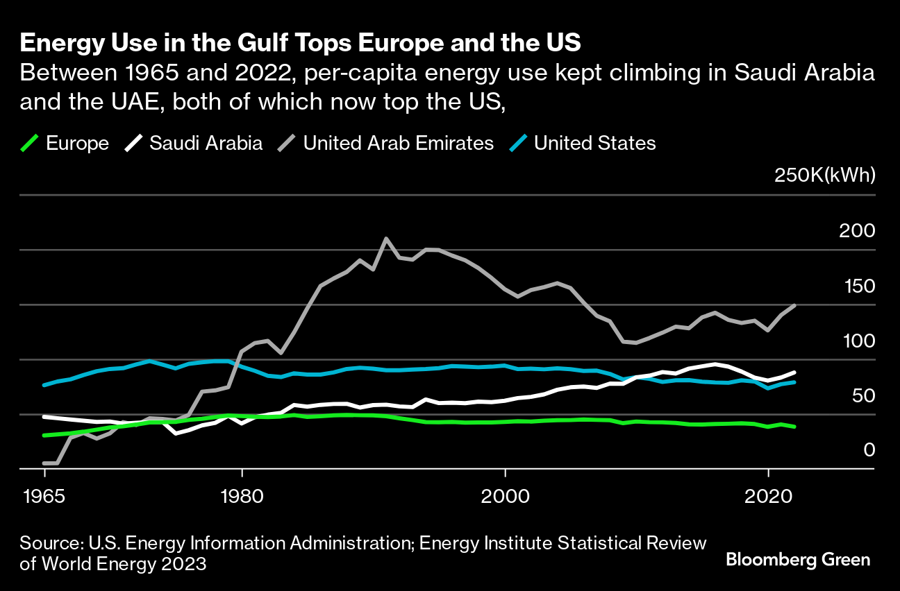 In the UAE, the government ditched some fuel subsidies, started promoting public transit and introduced a corporate tax — notable in a country that tends to draw foreigners looking to avoid taxes at home. Earlier this year, a Dubai Electricity & Water Authority campaign asked residents to “Make Smart Summer Choices Your Habit,” including turning AC down to 75F (24C, versus the customary 18C) and watering plants during cooler times of day to reduce evaporation.