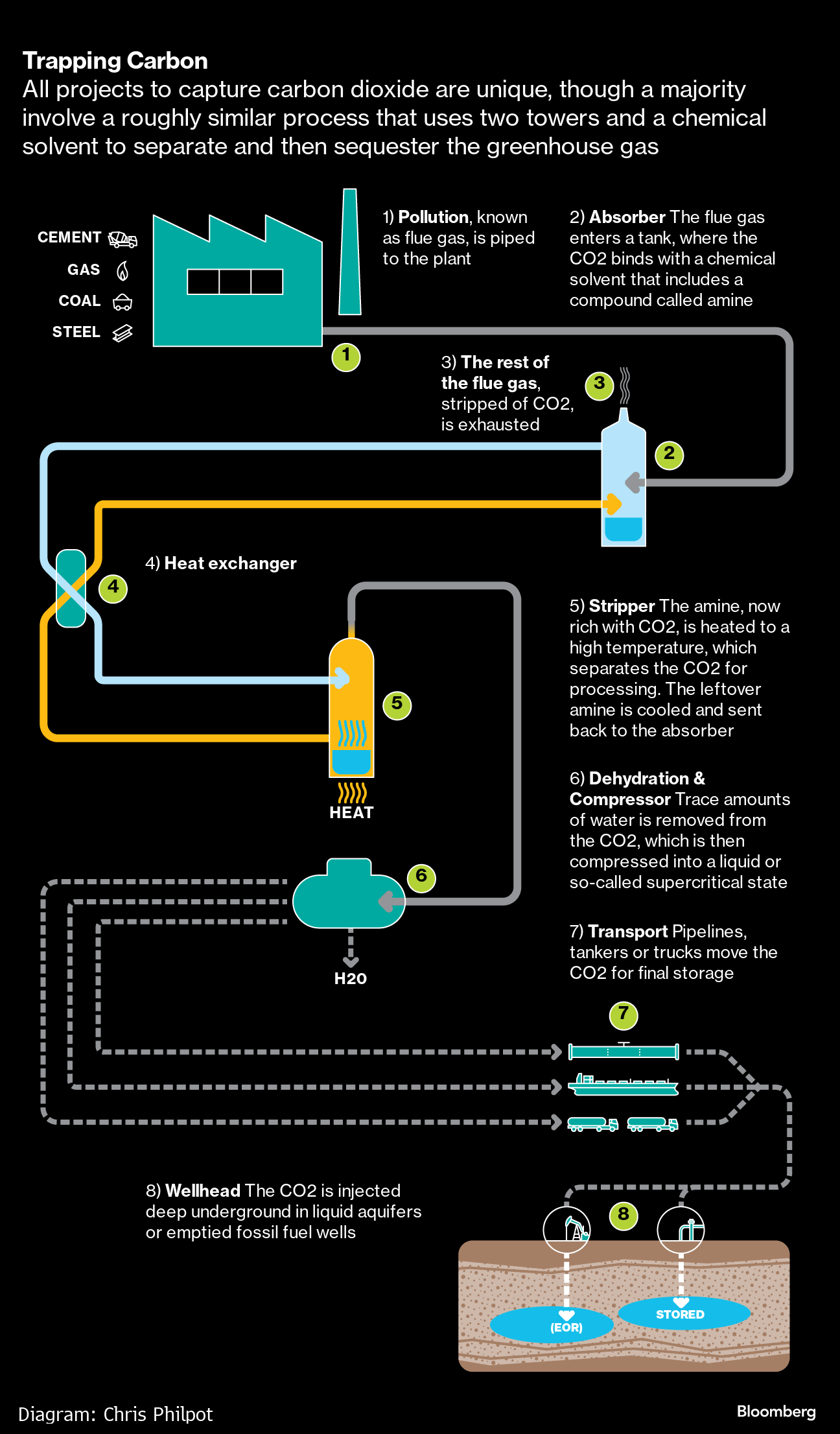 Capturing carbon is typically an eight-step process from production of CO2 to burial. At each stage, there’s a potential pitfall. The mixture of gases will be different based on whether the emissions being captured come from processing natural gas, a power plant that burns coal, a cement factory or the open atmosphere. At the end of the line, assuming no problems in collecting CO2, there will be wide variations in geology where the planet-warming needs to be sunk. It’s not just the equipment that must work in sync every step of the way but also the business case for operating at all — something that’s often balanced across several different companies.