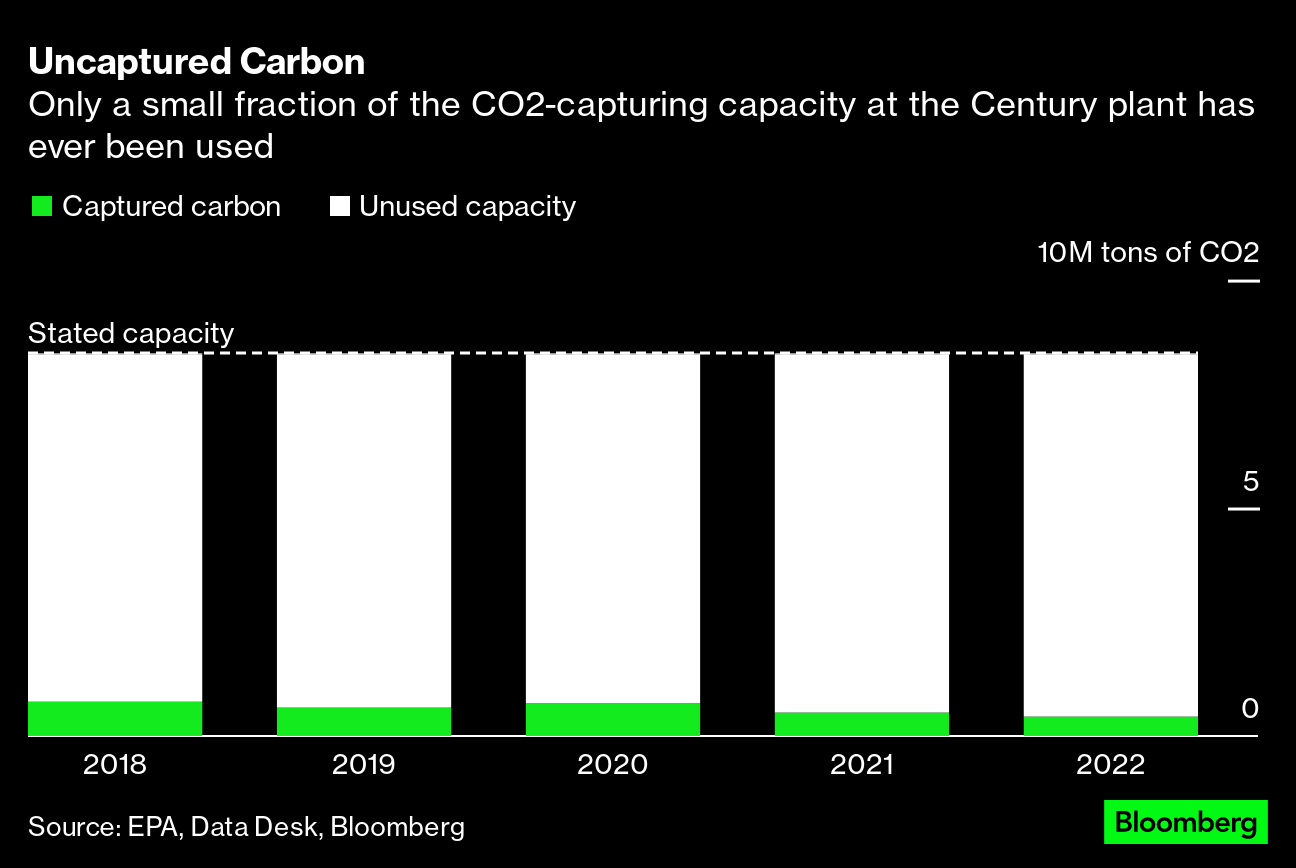 Century wasn’t. It never reached the projected levels of CO2 capture. From 2018 to 2022, Century captured less than 800,000 tons of CO2 each year, according to an exclusive analysis of US Environmental Protection Agency filings conducted by Data Desk, a consultancy that focuses on polluting industries. That’s less than 10% of the plant’s nameplate capacity. (Oxy didn’t comment on these figures.)
