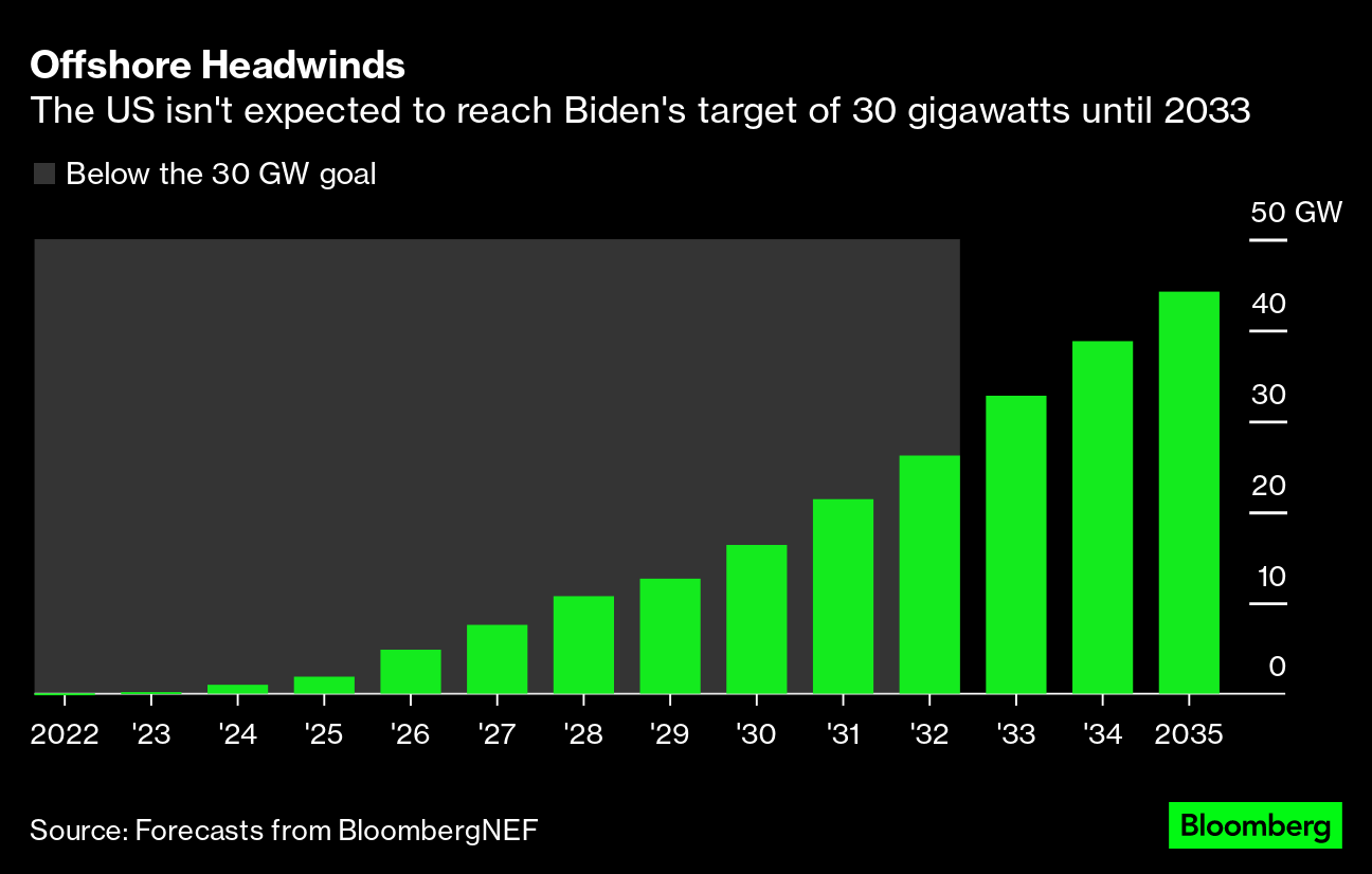 (Bloomberg) -- When President Joe Biden in 2021 laid out a target of deploying 30 gigawatts of offshore wind capacity during the next nine years, the plan was deemed bold and ambitious. Best of all, many saw it as within reach.