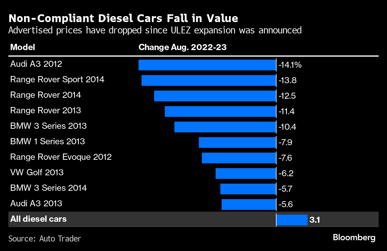 The expanded ULEZ is also hitting the value of diesel cars that just miss out on being exempt from charges, according to data from Auto Trader, a listing site for used vehicles. Under the new system, aimed at improving London’s air quality, motorists whose cars do not meet emissions standards, including most diesel automobiles registered before 2015, have to pay a daily charge of £12.50 ($15.18) just to leave their driveway.