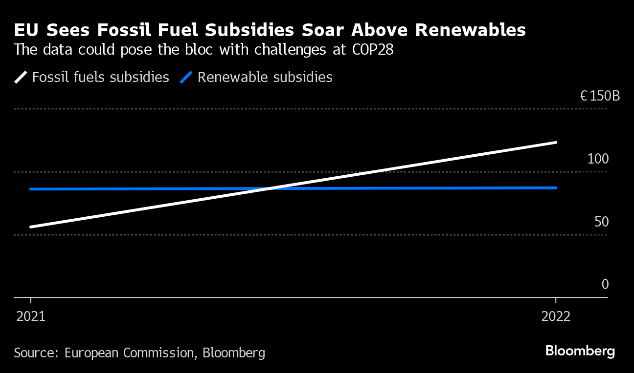 A separate report highlighted a worrying trend of surging subsidies for fossil fuels in the EU, jumping from €56 billion in 2021 to €123 billion in 2022 as the EU worked to ditch Russian supplies. Over the same time period, subsidies for renewables only marginally increased by €1 billion to €87 billion. Those figures stand in contrast to the EU’s position at COP28 next month — to phase out such support for oil, gas and coal.