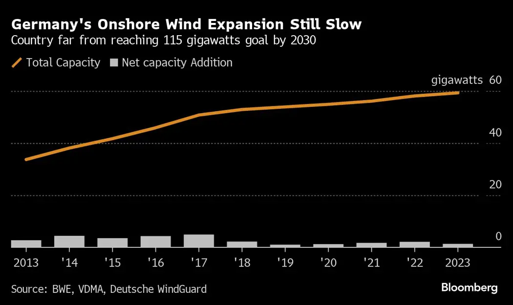 Wind, the second most important energy source after coal, will have to almost double to reach the government’s target of 80% clean power production by 2030. For onshore, that translates into about 27 new plants per week, but Germany has only added about five units a week in the first half of the year. Progress has stalled due to slow area designation and permitting, with local resistence against wind farms adding to the problem.