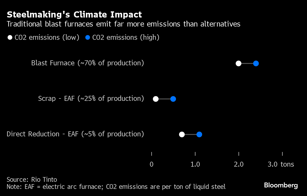 It’s an energy-intensive activity and one that produces about two tons of carbon dioxide for each ton of liquid steel, according to Rio.
