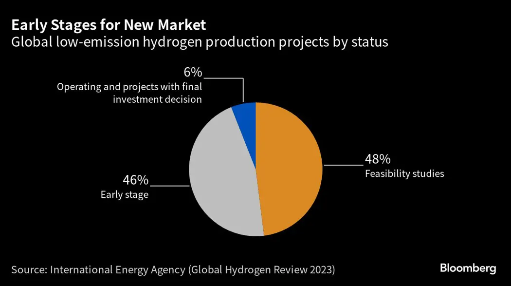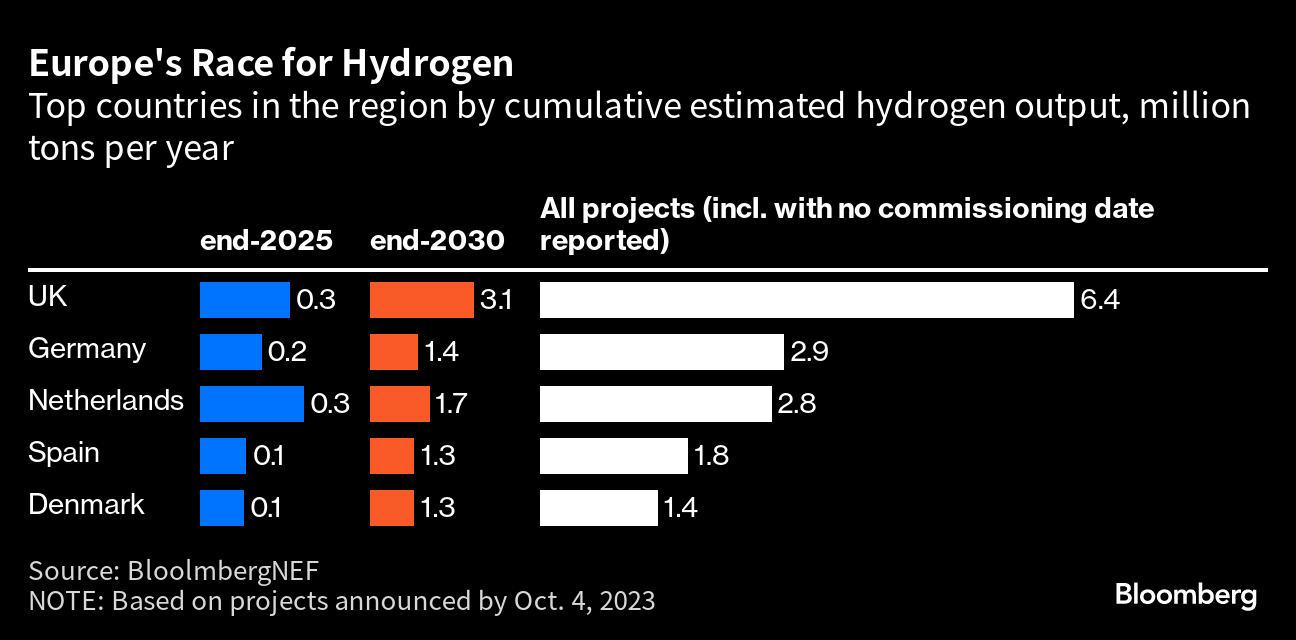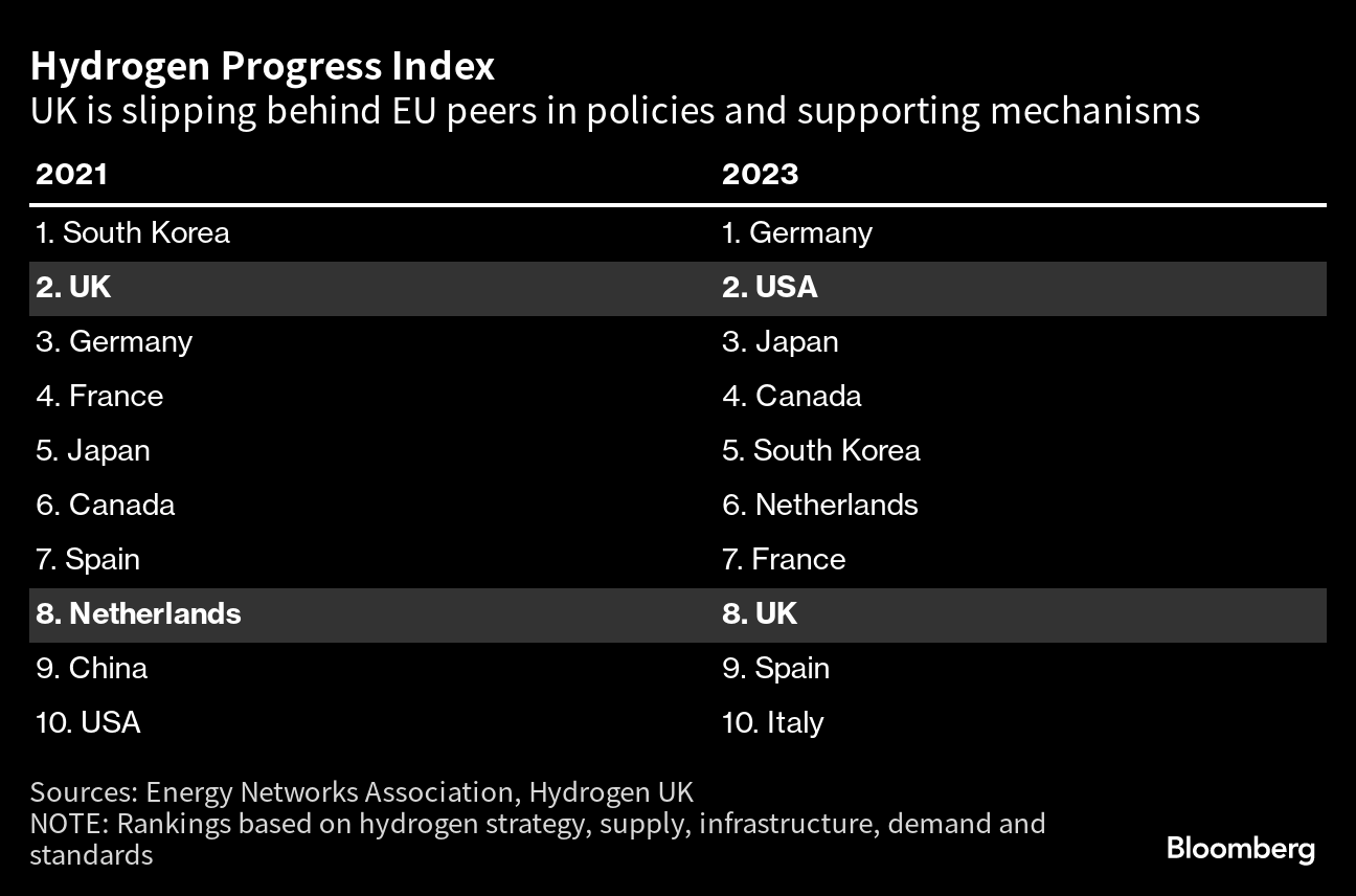 (Bloomberg) -- In 2021, the UK set out a bold ambition to become a ‘global leader on hydrogen’ by 2030. Two years later, delivery is falling short and it’s dropped behind European rivals jostling for a piece of the market.