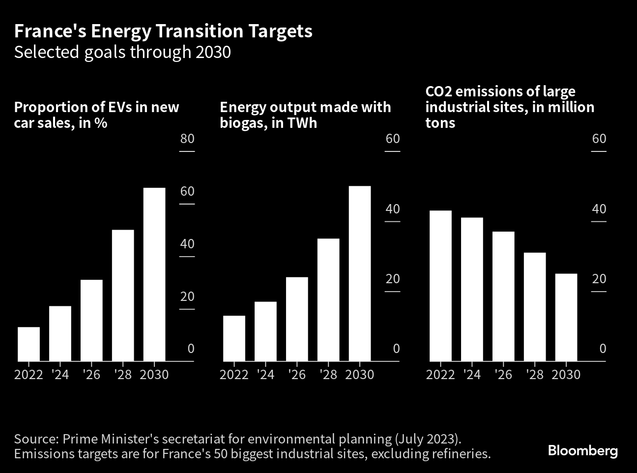 The French government aims to cut the country’s emissions by about one-third between 2022 and the end of the decade — in line with European Union targets for a 55% reduction from 1990 levels — by acting on more than 50 levers across industries.