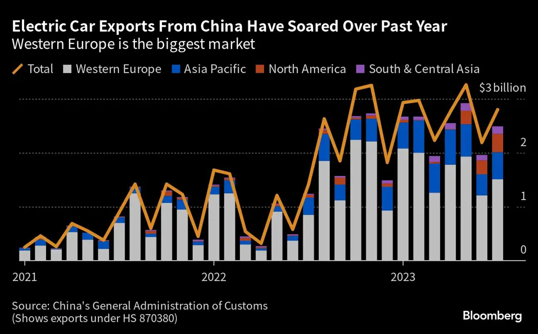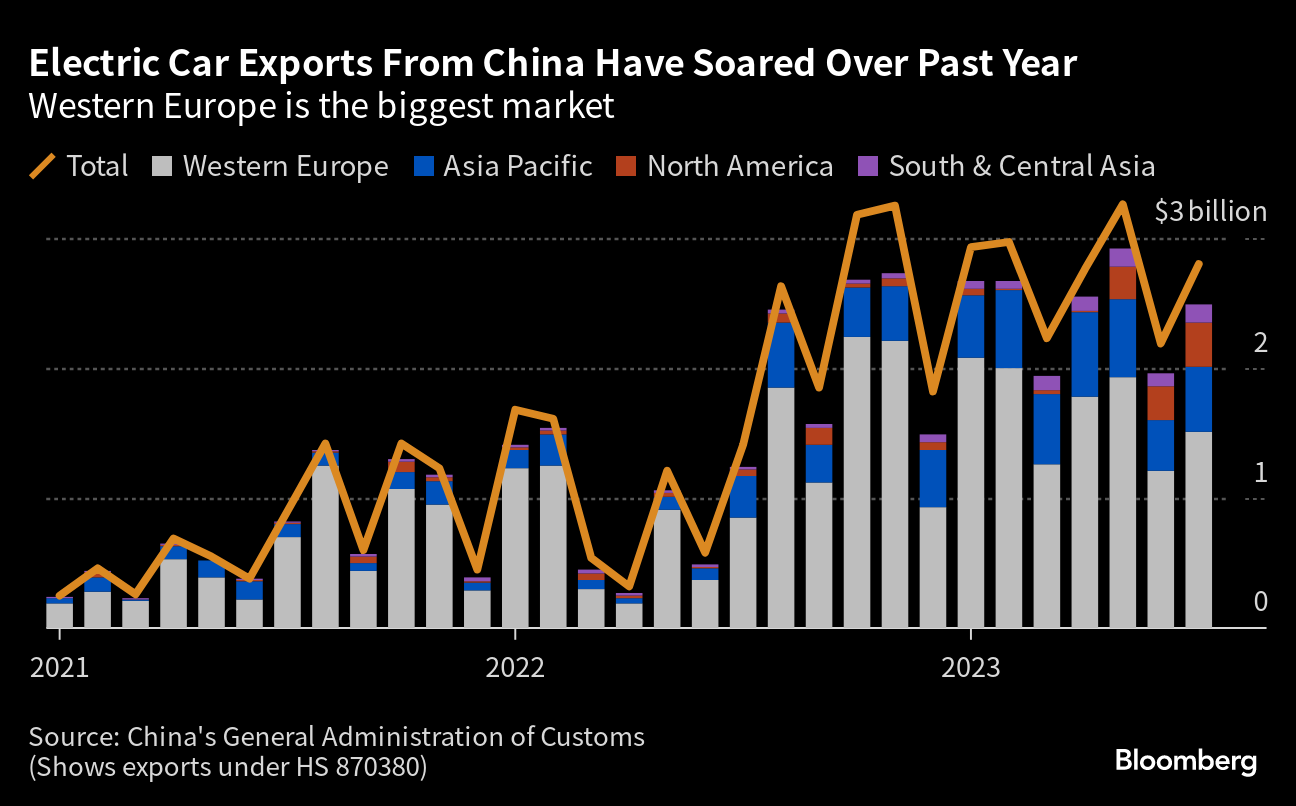 (Bloomberg) -- The number of Chinese-made electric cars going to Europe has soared in recent months, prompting the European Union to earlier this week announce an investigation into whether those vehicles are being unfairly subsidized.