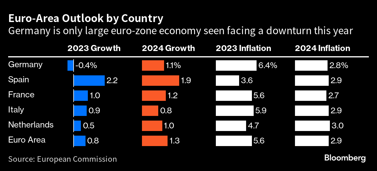 Six months after that prediction, Germany is stuck in a rut. On Monday, the European Commission’s outlook showed the region’s biggest economy suffering a contraction of 0.4% in 2023 — by far the worst performance foreseen for any of its peers. German officials now privately anticipate a similar outcome.