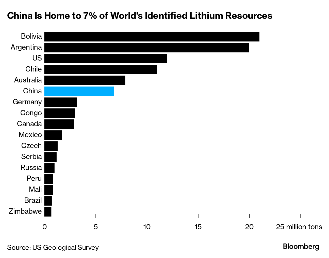 China is the biggest producer of electric vehicles and lithium is a key element in the batteries that power them. But the country holds just a fraction of the world’s identified reserves, which means it has to import over half of what it needs.