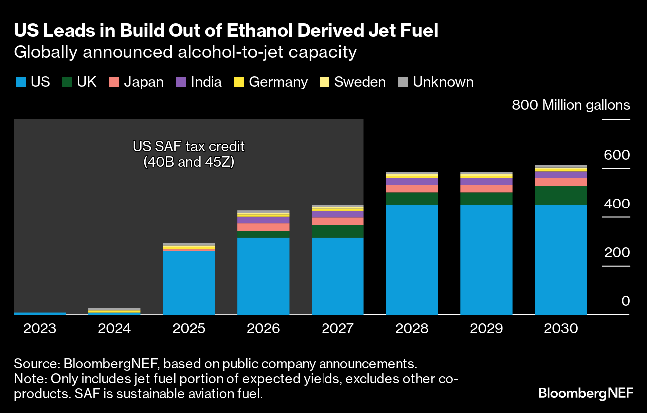 If it all works out, the US market for converting ethanol and other alcohols to jet fuel could grow to about $105 billion by 2050, according to BloombergNEF. That’s because the likes of United Airlines Holdings Inc. and other major carriers are under pressure to cut greenhouse gas emissions.