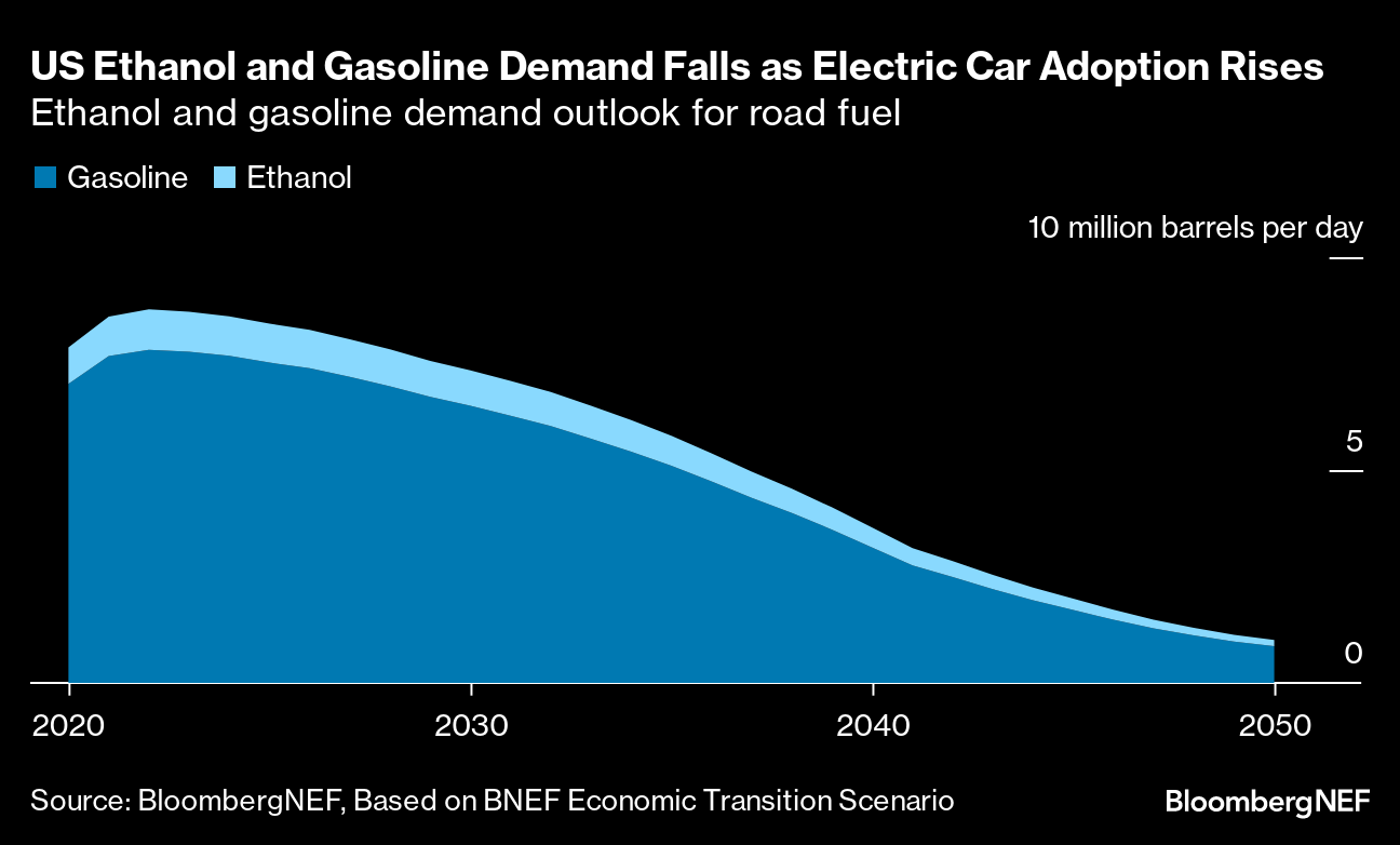 The clock is ticking. Ethanol consumption is set to plummet 12% by the end of this decade and almost 90% by 2050, according to BNEF, mirroring a drop in gasoline demand as EVs become more popular and gasoline engines more efficient.