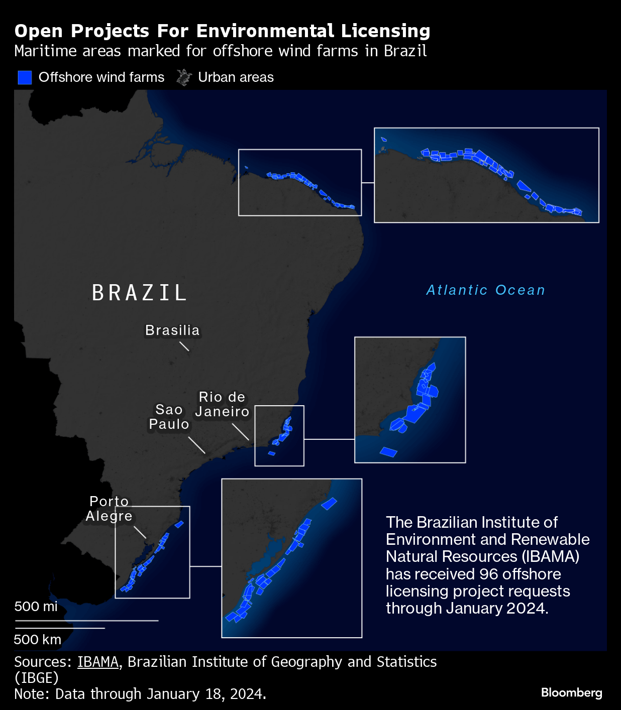 “We are waiting on the starting pistol,” said Jonathan Cole, the chief executive officer of offshore wind developer Corio Generation Ltd., which has set up an office in Rio de Janeiro in anticipation of licensing rounds. “There are a lot of big players sitting with projects that they are very excited and optimistic about.”