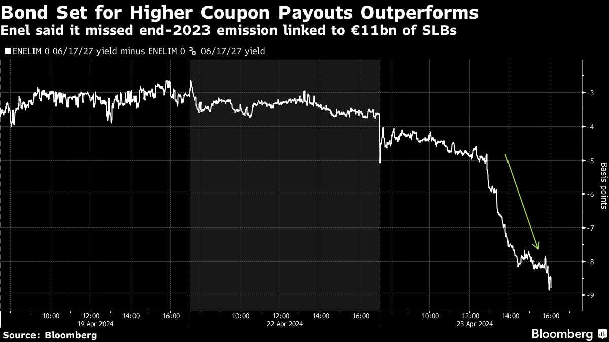 On Tuesday, an Enel bond due in 2027 that’s linked to the missed emissions target — meaning it’s set to see its coupon go up — outperformed a comparable Enel bond that isn’t linked to the sustainability target.