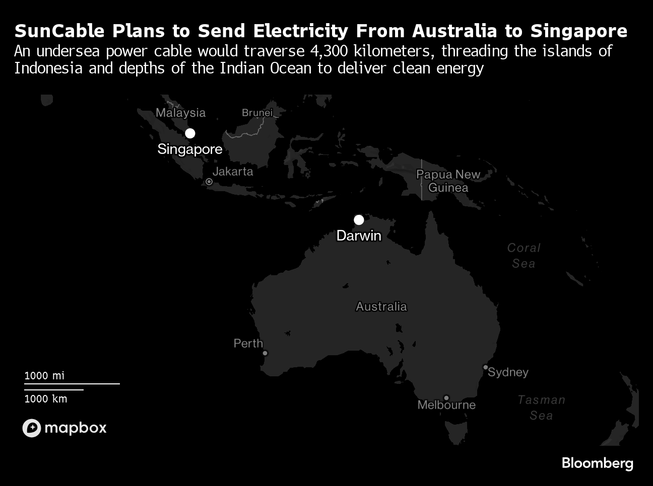 The link involves a 4,300-kilometer (2,670-mile) subsea power cable connecting a solar farm in Australia’s Northern Territory with more than 20 gigawatts of capacity to the city-state, which doesn’t have the available land to generate enough renewable power itself. Both the cable and the solar farm would be more than four times bigger than any others currently in operation internationally.