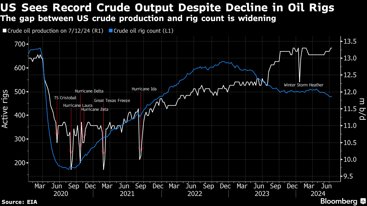 US crude production has been holding at a record high of 13.3 million barrels a day in July despite a steady decline in the number of rigs drilling in the oil patch. The number of American rigs are down nearly 10% since mid-April, sinking to the lowest level since December 2021, according to the Baker Hughes US oil rig count. Higher productivity per new well and using some of the stockpiles of drilled but uncompleted wells is helping boost the nation’s output.