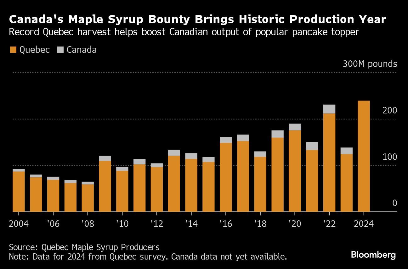 Pancake lovers rejoice! Early signs are pointing to an unprecedented maple syrup harvest this year in Canada — the world’s biggest supplier by far — thanks to a record season from Quebec farmers. Quebec, which accounts for 92% of Canadian output, churned out an all-time high of 239 million pounds of the sweet syrup this season, according to the Quebec Maple Syrup Producers, the group that oversees all aspects of the industry in the French-speaking province.