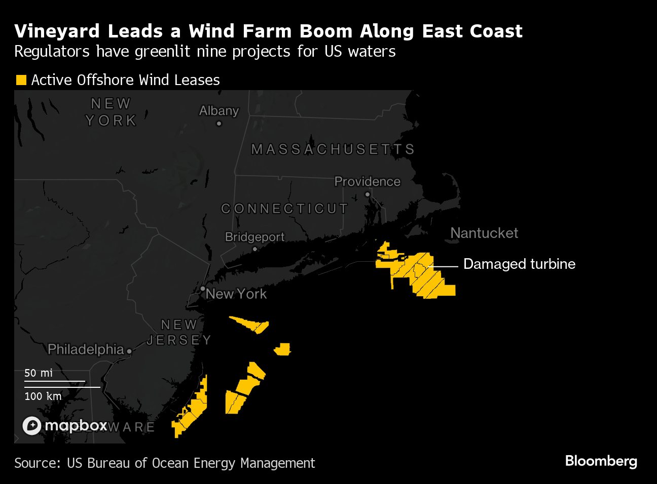 While their ire belies the fleeting nature of the event — waters were re-opened for swimming within 24 hours — the sense of harm felt by the community threatens to cast a long shadow. Vineyard Wind's project south of Nantucket is the fledgling industry's marquee venture, heralding a massive buildout of wind energy that would provide coastal cities with zero-carbon electricity. What happens here could have implications for a raft of other projects planned off Martha’s Vineyard, Atlantic City and elsewhere on the Eastern seaboard.