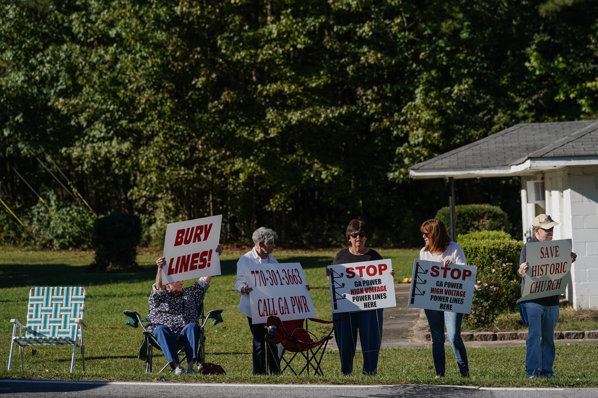 In Fayetteville, some 20 miles (32 kilometers) south of Atlanta, word of the data center turned the city against itself in an already divisive election year. Neighbors tried to persuade each another to keep up the fight and avoid accepting offers from Georgia Power. In October, four dozen residents convened outside a church and raised signs protesting the line. Members of the patriotic group Sons of the American Revolution fired muskets while cars blared horns in solidarity.