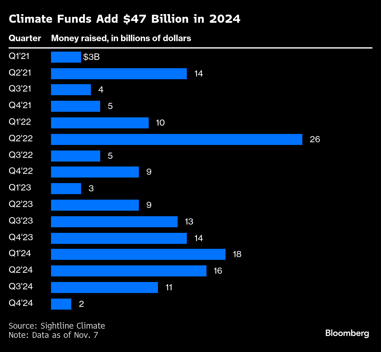 (Bloomberg) -- The amount of new capital for climate tech investing climbed globally in 2024, a hopeful sign that the sector is poised to grow despite still-high interest rates and likely regulatory changes ahead in the US.