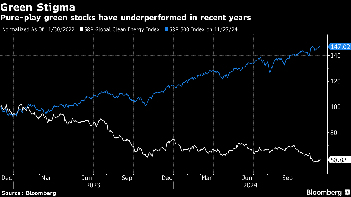 It’s a conversation that feeds into an increasingly tense backdrop for climate finance. Pure green investments such as solar and wind have largely proved a losing bet in recent years, with the S&P Global Clean Energy Index down almost 40% since the beginning of 2023. In the same period, the S&P 500 Index has gained more than 50%.