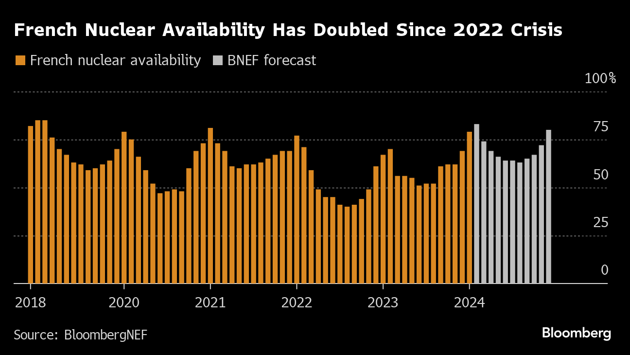 France had 79% of operational nuclear capacity available in January, almost double the low seen in August 2022, and that may rise to 83% in February. With fewer repairs planned this summer than in recent years, reactor availability in 2024 will be the highest since at least 2019, BloombergNEF forecasts show.