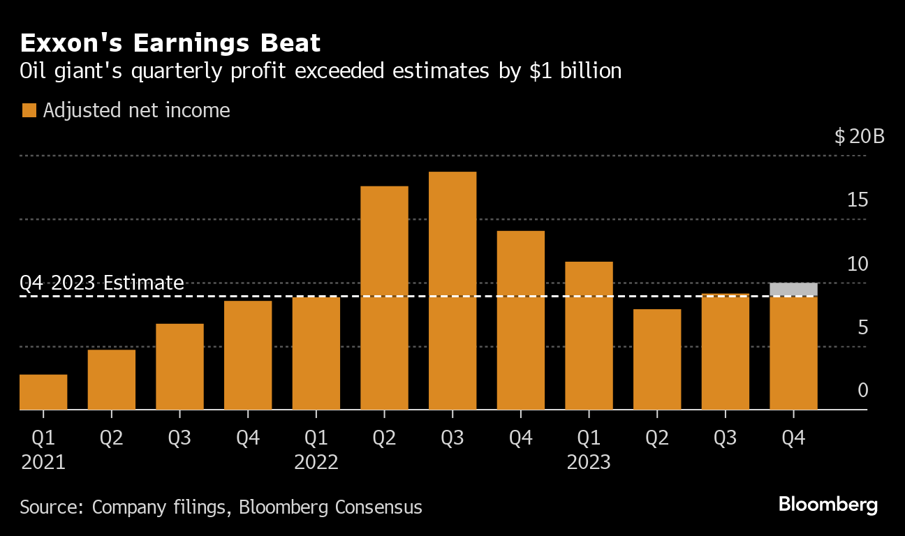 Exxon rose as much as 1.6% in New York and Chevron climbed 2.8%. Exxon’s outsized result also was aided by a $1.14 billion boost from unsettled derivatives and record fuel production at its refineries.