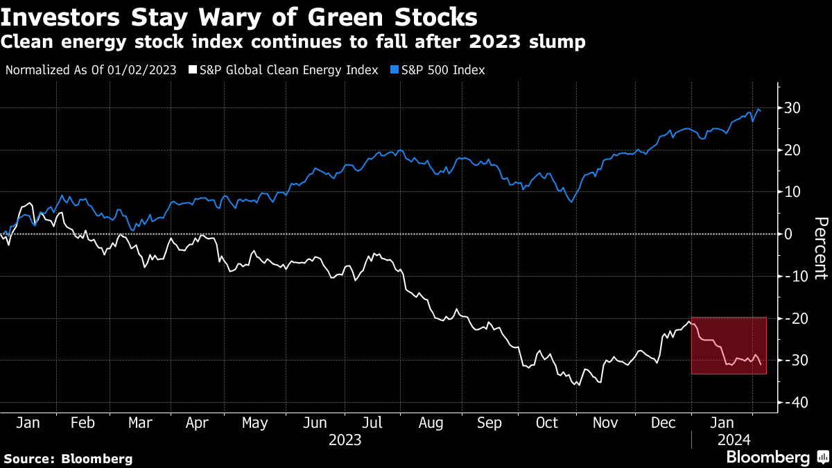 Last year the S&P Global Clean Energy Index, whose members include wind park operator Orsted A/S and solar products and services maker SunPower Corp., slumped more than 20%. And so far in 2024, the index has continued to slide, down about 10%. By comparison, the S&P 500 Index rose about 24% in 2023 and has gained about 5% year-to-date. Barrs at GSAM didn’t single out any individual stocks.