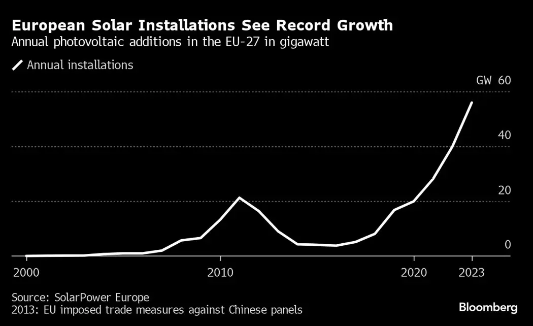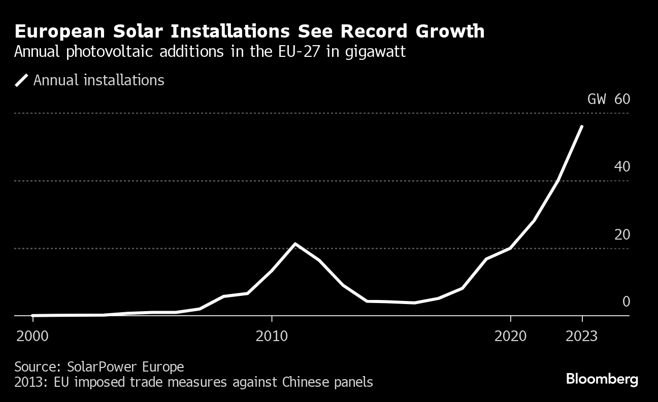 The situation is a grim reminder of events that hurt Europe’s photovoltaic industry about a decade ago. Back then, the EU imposed import tariffs on Chinese solar panels after the Asian country ramped up industrial policy, contributing to a steep decline in European solar deployment. Hosts of companies closed their solar operations in Europe, such as Robert Bosch GmbH.