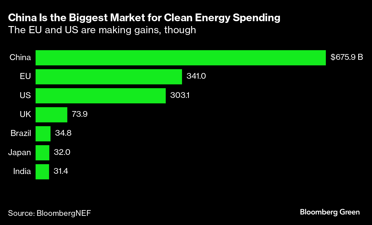 China remains the biggest market by far with $676 billion spent last year. That’s an increase of only 6% compared to 2022, though. Investments in the US, the UK and Europe grew by at least 22%, in comparison, to a combined total of $718 billion. That was driven in part by incentives in the Inflation Reduction Act, the flagship US climate law, which is starting to have a significant impact. Strong sales of electric vehicles in the UK as well as booming demand for renewables across Europe also helped drive up the total.