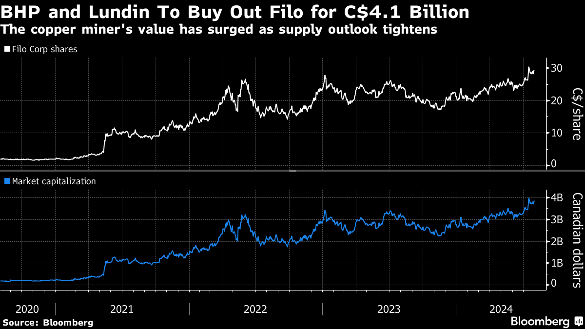 (Bloomberg) -- BHP Group Ltd. — fresh from being rebuffed by Anglo American Plc — swooped to buy Filo Corp., teaming up with Lundin Mining Corp. in a $3 billion deal to gain South American copper assets.