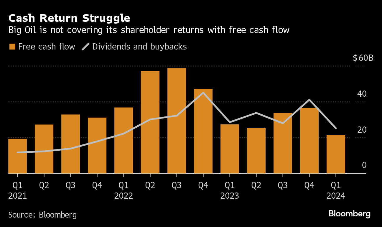 The hit to refining, which often acts as a hedge against volatile crude and natural gas prices, comes at a time when Big Oil is finding it more difficult to keep up with shareholder demands for higher crude output and cash returns. Executives have resorted to delaying low-carbon projects and piling on more debt to fund buybacks, dividends and future fossil-fuel production.
