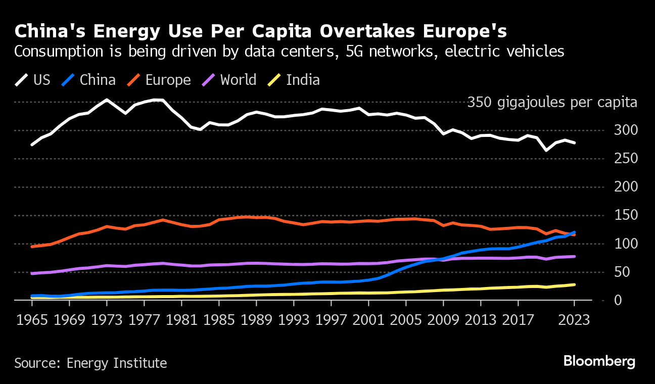 (Bloomberg) -- China’s energy use per person surpassed Europe’s for the first time last year as demand from technology and manufacturing industries continued to climb.