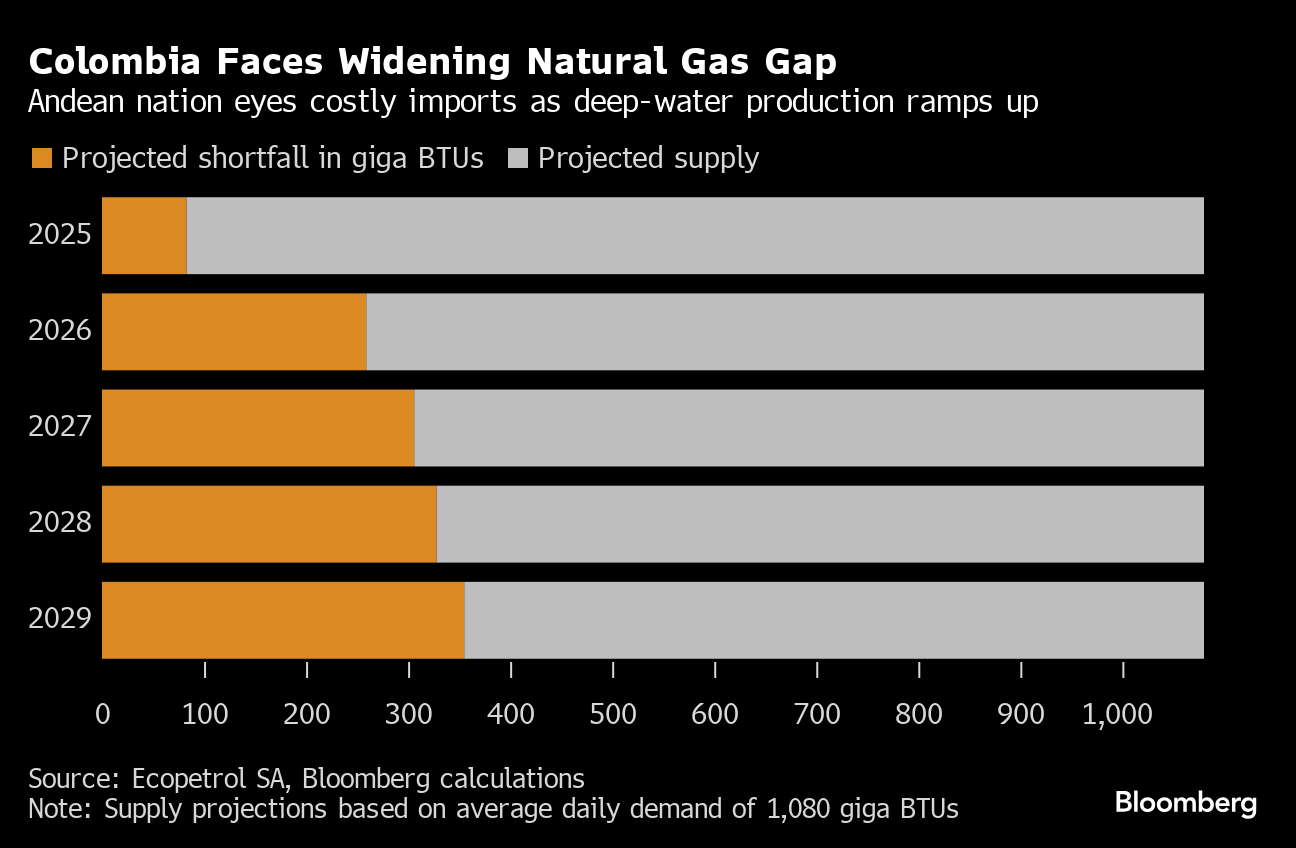 Even with some runway left, Ecopetrol sees an 8% gap between the gas supply and total demand beginning next year, widening to around 25% in 2026 and 30% the year after. The firm’s forecasts imply shortfalls will continue above that level until around 2030 when underwater deposits begin to meet demand.