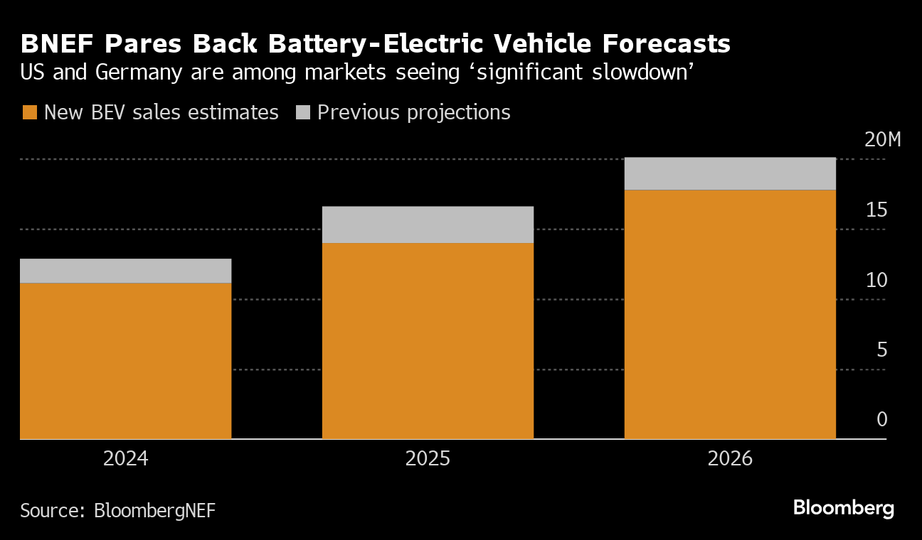 (Bloomberg) -- Electric vehicles have swiftly gone from a bright spot in the global climate fight to cause for concern, leading BloombergNEF to slash sales estimates and warn that the auto industry is falling further off the track toward decarbonization.