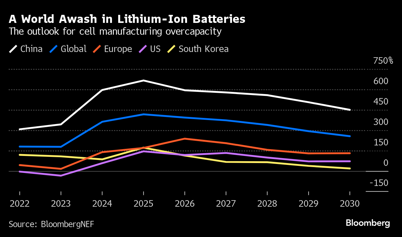 China has doled out incentives likely totaling in the tens of billions of dollars and can now make far more batteries than it needs, which is driving down prices in dramatic fashion, BNEF said. The nation’s cell manufacturing capacity already was more than three times domestic demand last year and will rise to more than six times in 2025, if all factories planned for the country come online.