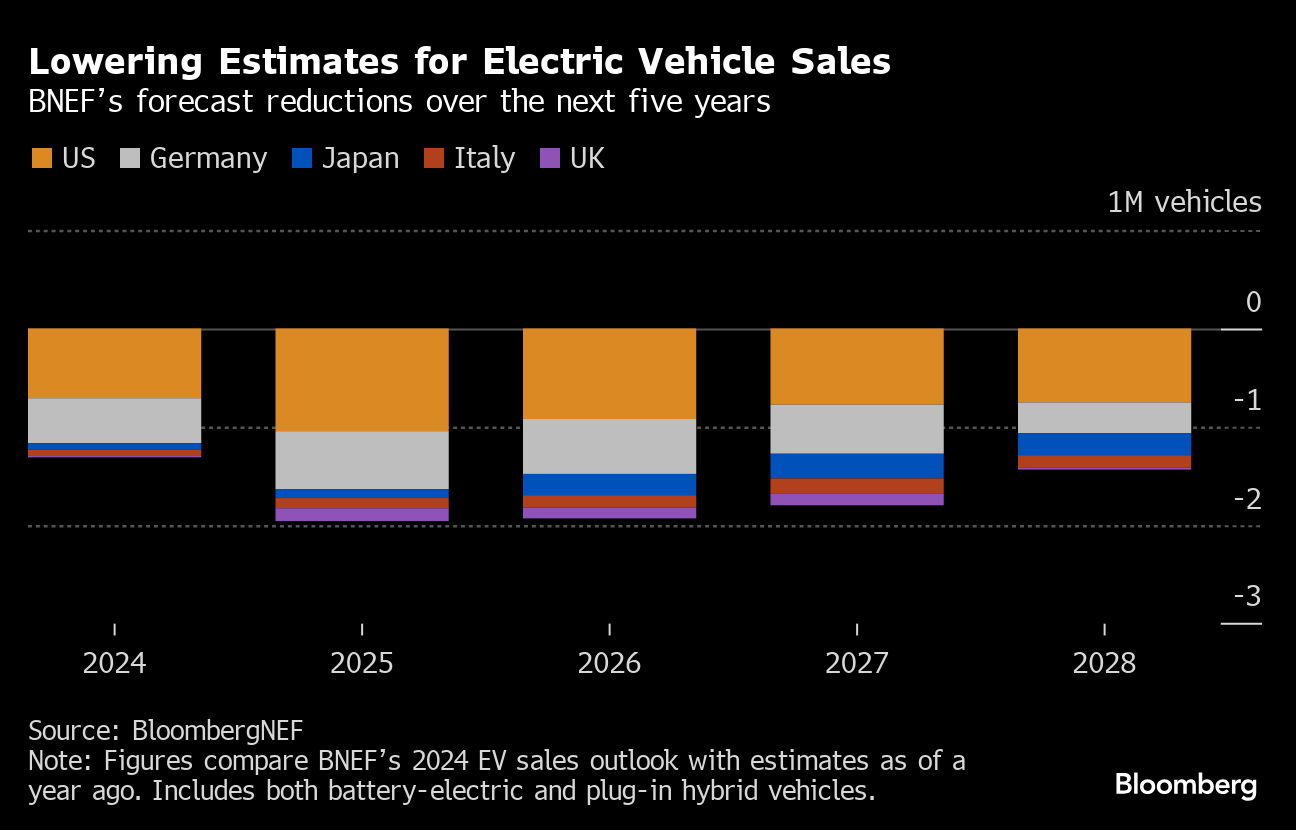 Battery price declines haven't been nearly as steep in other major markets, contributing to BNEF cutting its overall EV sales projections — which include plug-in hybrids — for this year and each of the next four years in the US, Germany, Japan, Italy and the UK.