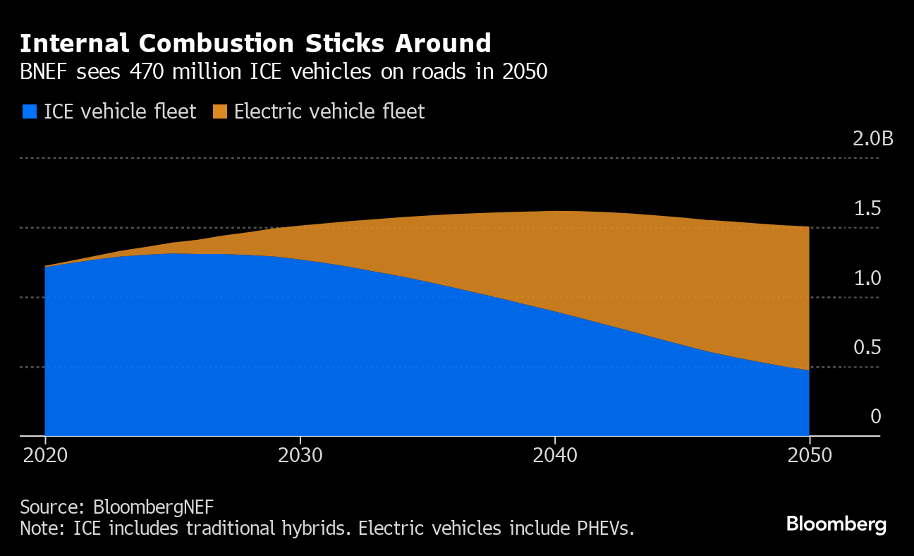 The global fleet of internal combustion engine vehicles is expected to peak next year, but sales would need to end altogether by around 2038 for the world to get to a completely zero-emission fleet by 2050.