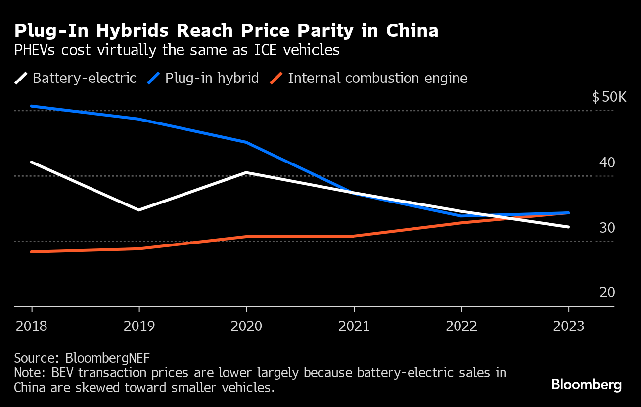China became the world’s top market for PHEVs in 2022, thanks to the introduction of affordable models from BYD and Li Auto Inc. PHEVs now sell for virtually the same average price in China as vehicles running entirely on internal combustion engines.