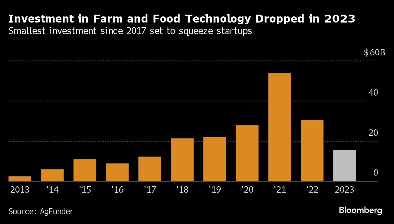 But once-plentiful funding has rapidly dried up. The global “agrifoodtech” sector raised $15.6 billion globally in 2023, down nearly 50% from a year earlier and the lowest level since 2017, according to an investment report from venture capital firm AgFunder.
