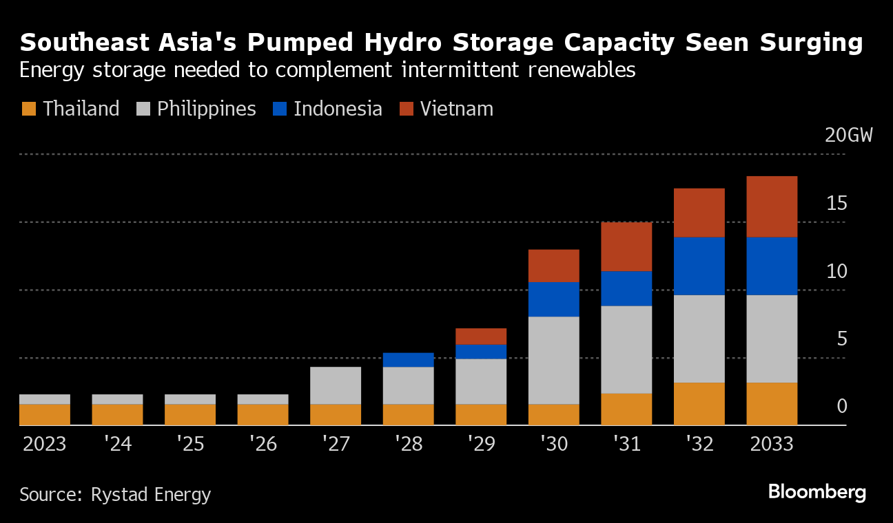 Capacity for pumped hydro, which uses water and gravity to save excess power until it’s needed, will increase nearly eightfold and hit 18 gigawatts by 2033, the report said. While Thailand currently has the largest capacity, the Philippines will soon take the lead as the nation has about 5.7 gigawatts in the pipeline, the report said.