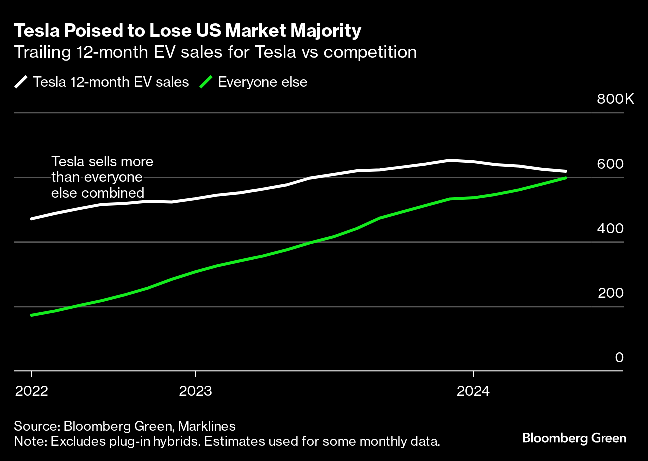 In the 12 months through May, Tesla sold approximately 618,000 electric cars in the US, compared with about 597,000 fully electric vehicles sold by other manufacturers, according to the latest figures from Marklines, a provider of monthly auto industry sales data. Next week, carmakers are slated to report second-quarter sales, which will include popular new models from General Motors Co., Hyundai Motor Co. and its affiliated Kia Corp.