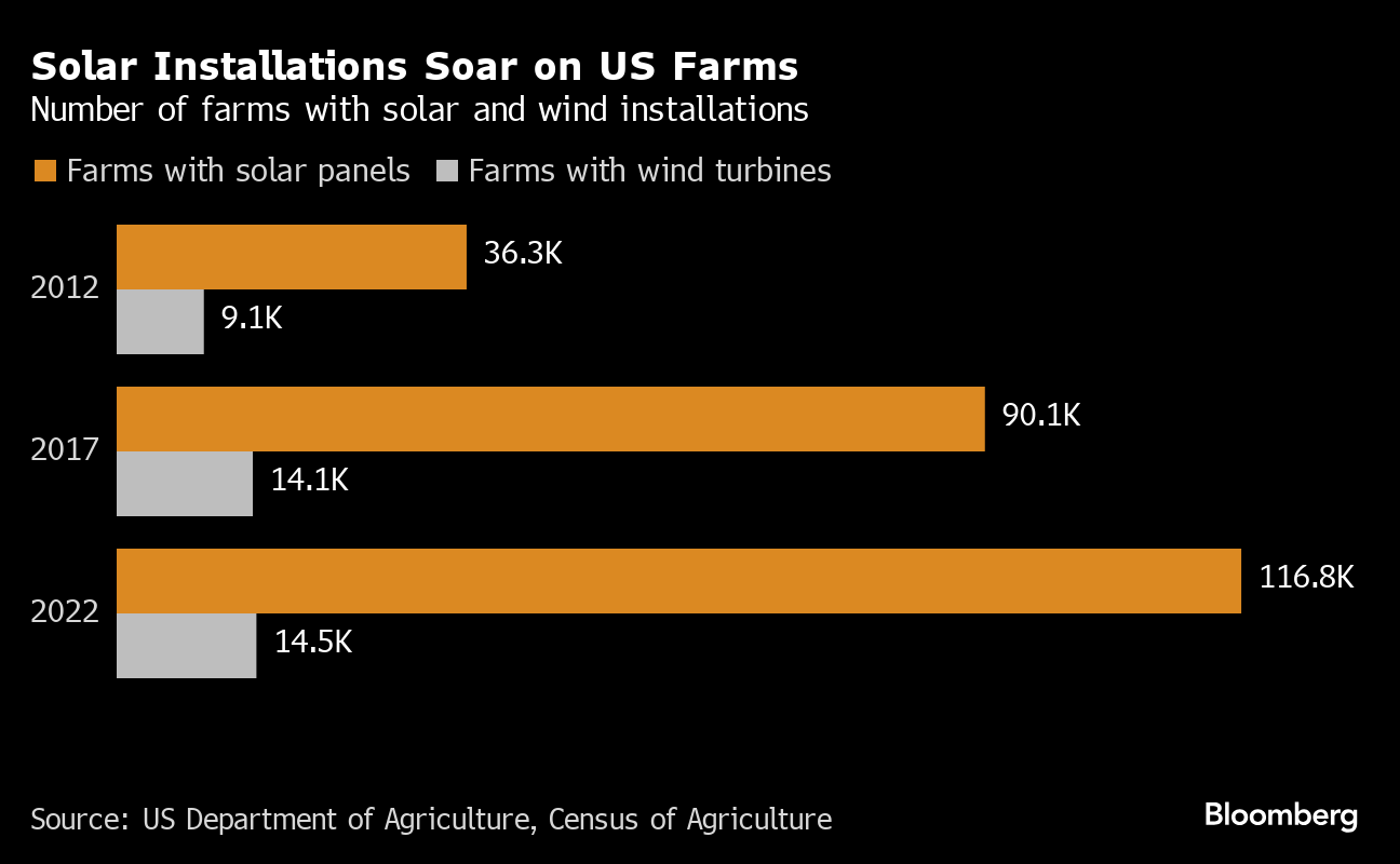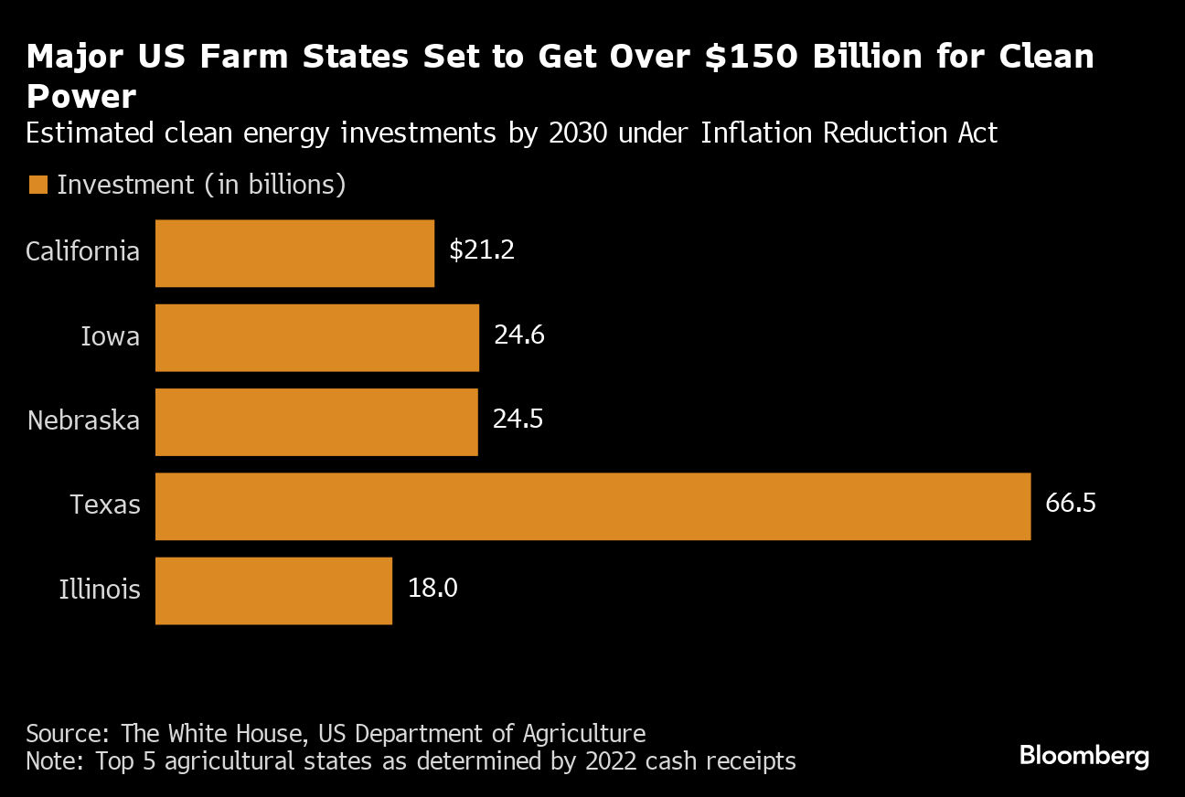 The movement is certain to get a kick from President Joe Biden’s Inflation Reduction Act, which has helped accelerate the clean energy boom through tax incentives for solar developers. The country’s five largest agricultural states are among the biggest beneficiaries, poised to receive about $155 billion in clean power investments by 2030.