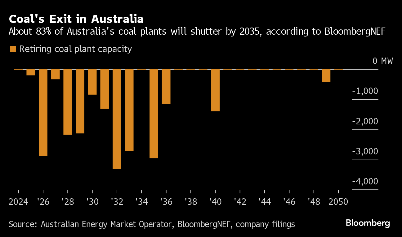 More than 80% of Australia’s coal plants are likely to close by 2035 as a result of weaker earnings, declining reliability, and as states and companies aim to meet decarbonization targets, BloombergNEF said in an October report.